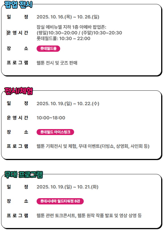 공식 사이트에 따르면, 롯데타운 잠실을 중심으로 팝업 전시, 웹툰 스테이지, 월드 스테이지 등 다채로운 프로그램이 마련되어 있다고 합니다.
